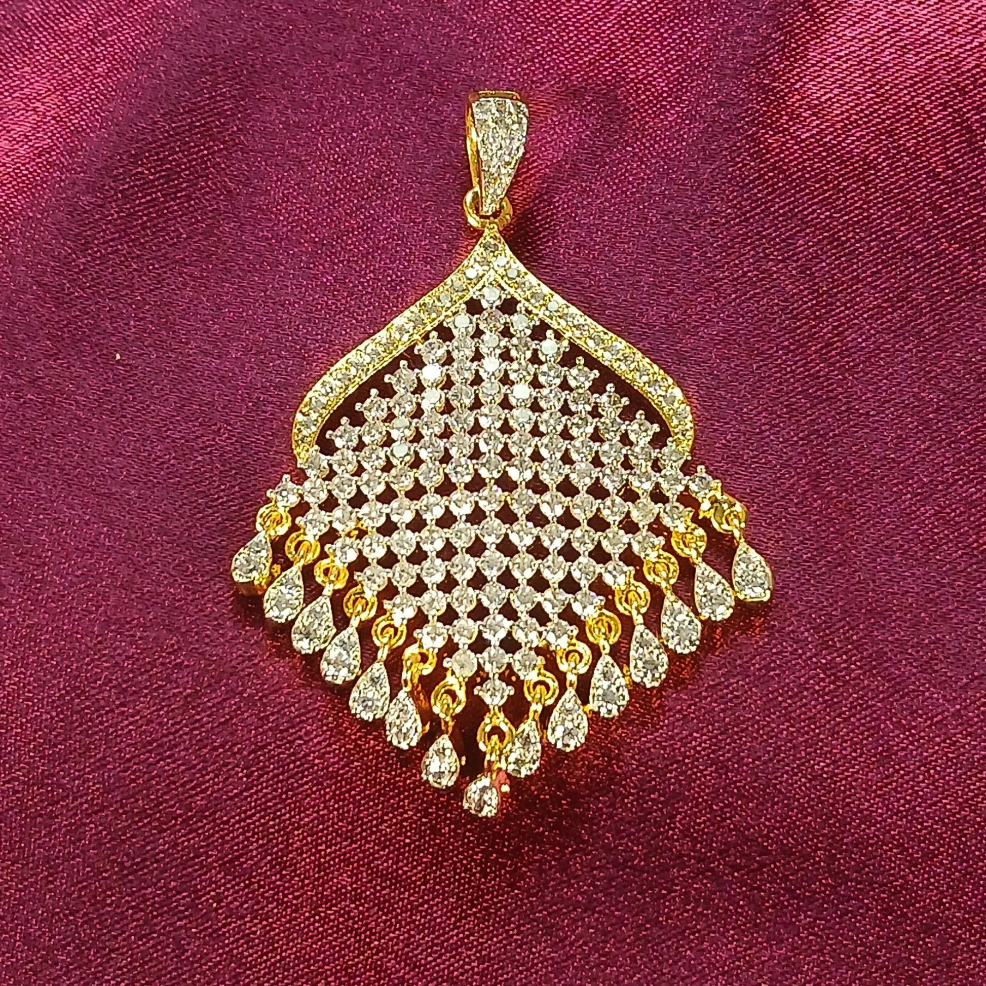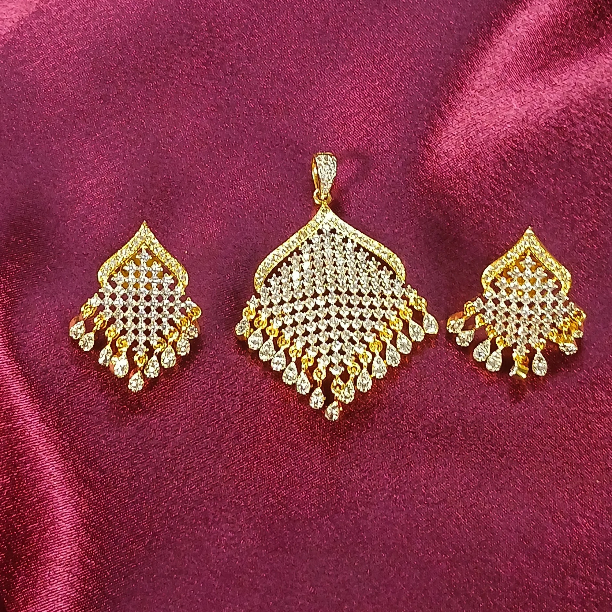 A delicate lattice of sparkling American diamonds finished with graceful dangling drops that shimmer with every movement.An elegant pendant set designed to bring festive charm and timeless sophistication to your look.